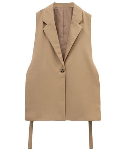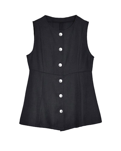 フェミニン系のファッションにマッチする、コンパクトなペプラムシルエットのジレです。