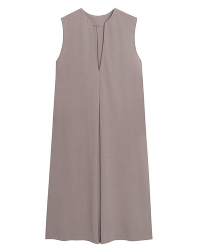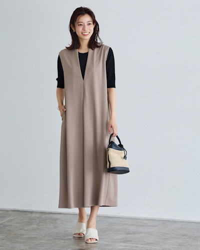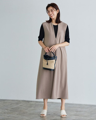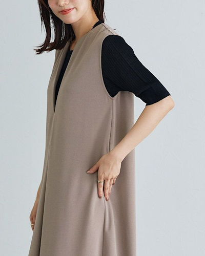 ジャンパースカートはキーネックがポイントで、開きすぎないフロントがオフィスでも好印象。落ち着いたグレージュも秋らしいですね。