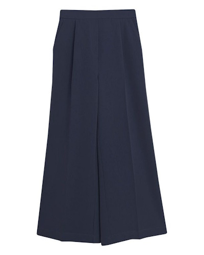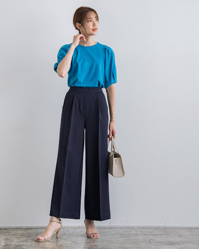 夏よりトーンを落としてシックに仕上げたダークネイビーのワイドパンツ。