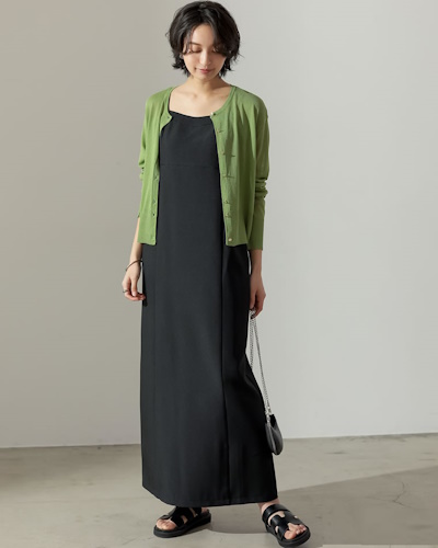 オフシーン①グリーンカーディガン×ブラックワンピースのコーデ