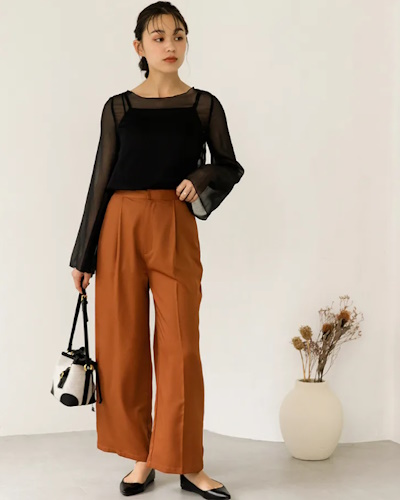 オフシーン②ブラックシアートップス×ブラウンパンツのコーデ