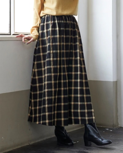 裾に向かって広がるスカートやワンピースは、お腹やヒップをカバーしたい人に最適。