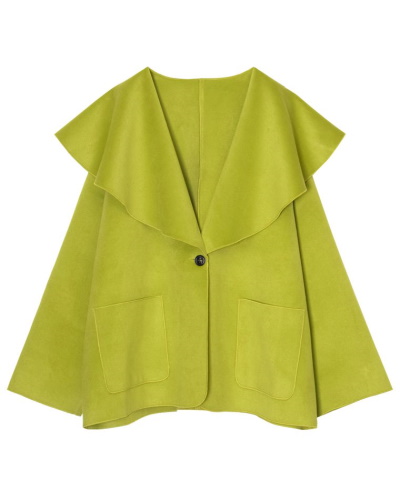 大きめの襟がついたアウターなら、オシャレを楽しみながら小顔効果も狙えますよ。