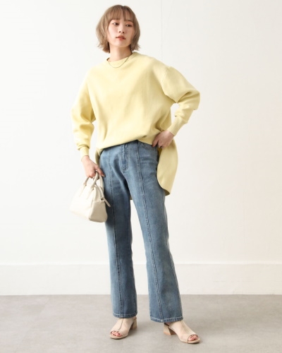 オフタイムのひと時には、もちっとした肌触りのスウェットトップスと履きやすいデニムパンツで、ゆったりストレスフリーに過ごしましょう。