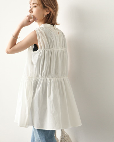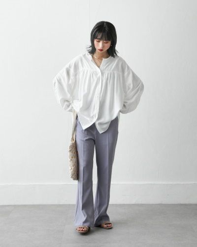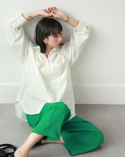 シャツは前開きでアウター風に羽織っているので、ショッピングで素敵なトップスを見かけても、さっと試着ができてスマートです。