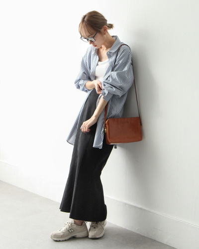 体の泳ぐビッグシャツとロングタイトスカートの組み合わせは、ゆるさと上品さのバランスが絶妙で、カジュアルだけどきれいめにしたい大人のお出かけに最適です。