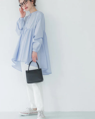 胸元で切り替えたチュニックブラウスはお腹周りが気にならず、ランチやスイーツをゆっくり楽しみたい時にもおすすめ。