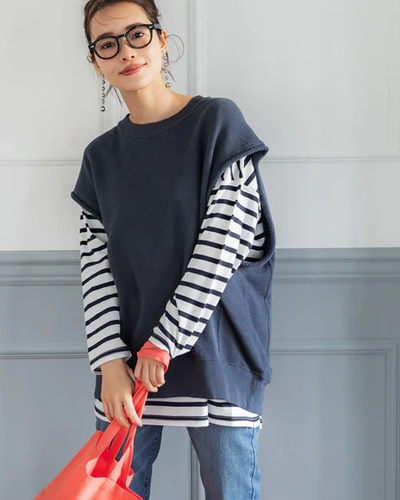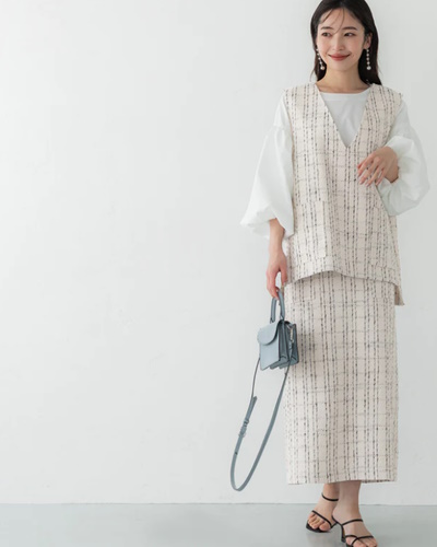 ベストとスカートはシルエットがまっすぐで、体のラインをきれいに見せてくれます。
