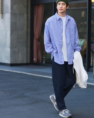 見た目はやっぱりシンプルなボーダー柄で、どんなボトムスでも合わせやすいので、非常に使い勝手の良いシャツだと思います。