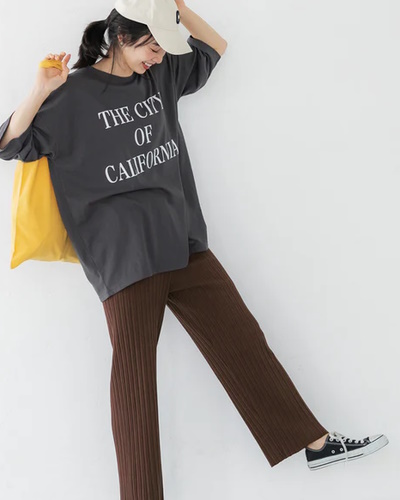 シンプルで合わせやすいのは、英字がプリントされたシンプルなTシャツ。