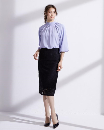 コンサバファッションの特徴である女性らしさを引き立てるため、トップスには控え目なパフスリーブをチョイス。