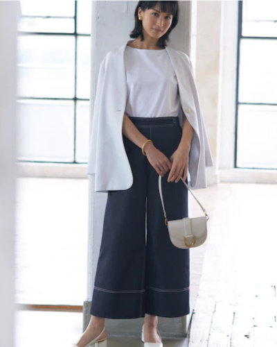 カジュアルになりがちなワイドパンツも、足首が見えるクロップド丈なら、もたつきがなくスッキリとした印象です。