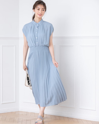 清涼感と透明感が夏にぴったりですね。デザインでは、ハイネックとフレンチスリーブがポイントで、露出を控えて上品に見せています。