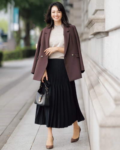 通勤やお出かけに大活躍のジャケットは、肌に溶け込むレッドブラウンを選んで、大人の美しさが際立つコンサバコーデに。