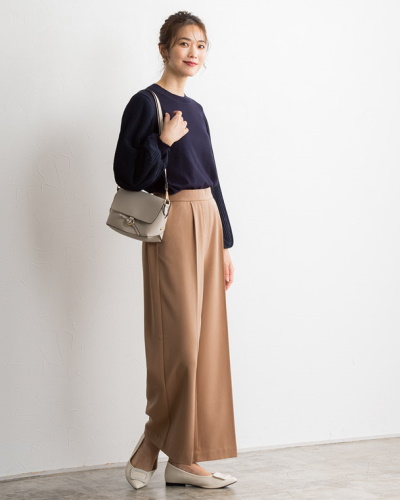トレンドのワイドパンツでコンサバスタイルを作るなら、落ち着いたネイビーやブラウンを選び、カジュアル感を払拭するとよいでしょう。