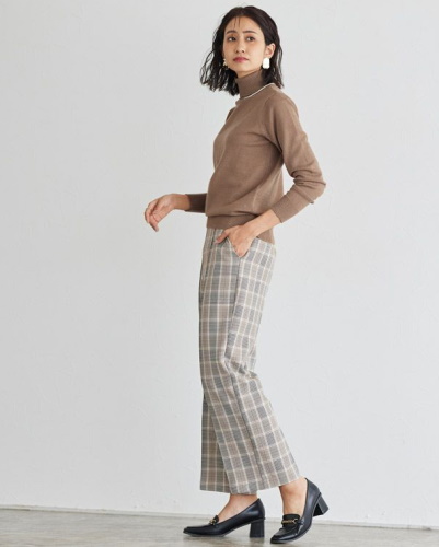 タートルネックのニットとチェック柄のパンツで、シーズンムードが漂うコンサバコーデに。