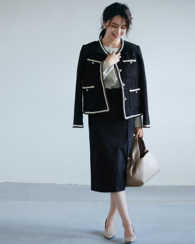 ネイビーでまとめたツイードジャケットのコーディネートは、入学式や卒業式のような式典にも着ていけます。