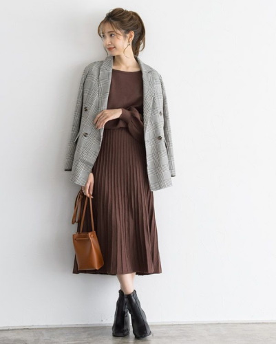 スカートの部分にプリーツが入ることで、カジュアルさを抑えた知的な印象に。ワンピースが単色なので、小物使いで変化を楽しめるでしょう。