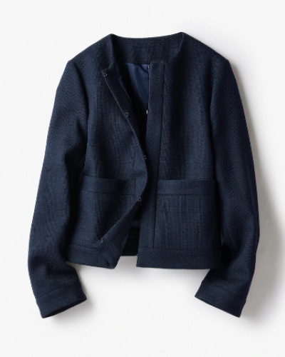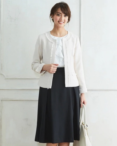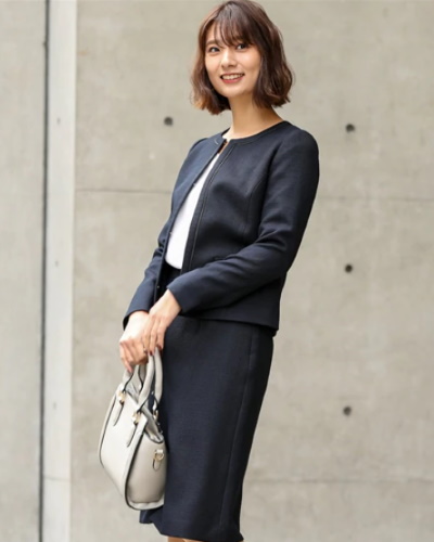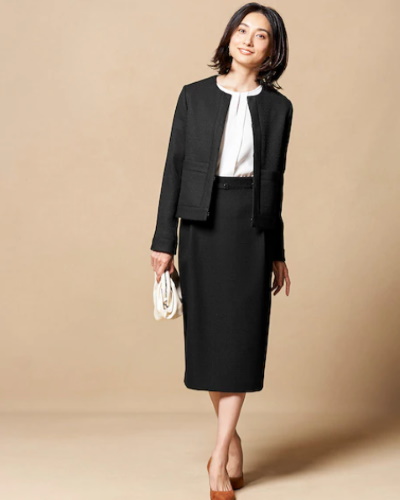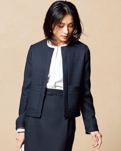 定番のデザインは襟元が開きすぎていないノーカラータイプで、パールのネックレスとの相性は抜群です。