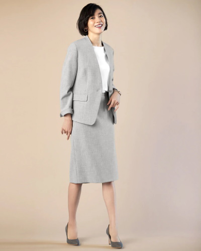明るく清潔感のあるライトグレーのノーカラースーツ