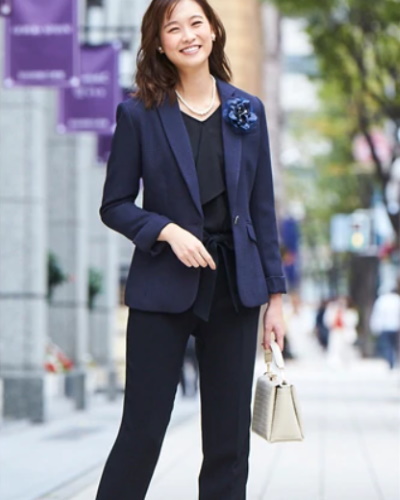 シンプルなネイビーのジャケット、フリルの落ち感がきれいなブラウス、ウエストリボンのついたパンツ、そして色味を合わせたコサージュの全てがセットになっています。