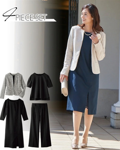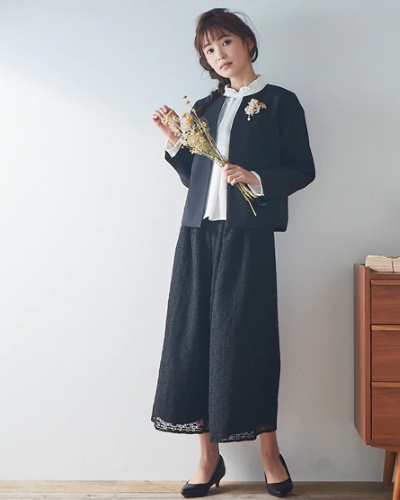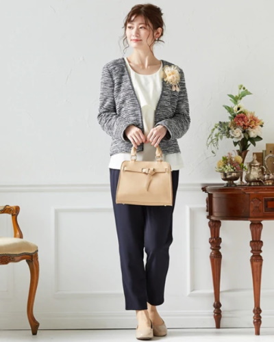 落ち着いた雰囲気の装いとしては、ジャケットとスカート、またはワンピースやパンツを合わせたスタイルが無難です。