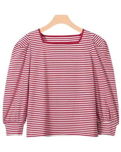 画像のようなボリュームスリーブのデザインは、肩にボリュームも出せていいこと尽くめ。ボーダーが浮かび上がる凹凸生地を使い、生地の面でも肩幅をカバーしてくれますよ。