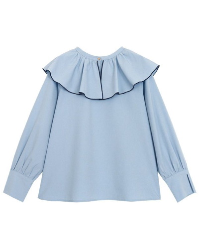 なで肩さんの下がった肩をおしゃれに隠せるのが、襟が横に広がるビッグカラーのブラウスです。
