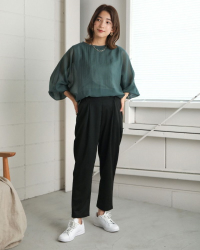 タックが入ったパンツは、自然な膨らみで下半身のシルエットをきれいに見せてくれます。