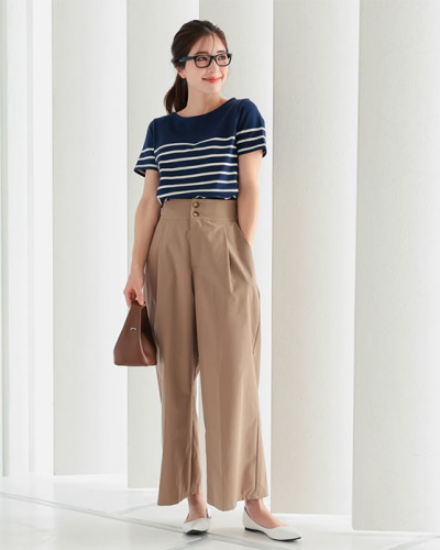 トップスをインしてバランスよくコーディネートするなら、お尻の境目が目立たないワイドパンツがおすすめ。