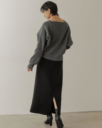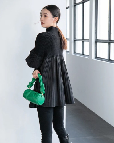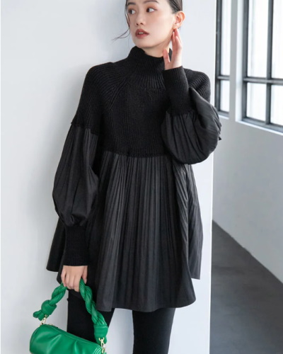 こちらのアイテムのように、切り替えより上がリブニットになっていると、ぴったり×ふんわりのバランスに仕上がるため、ボリュームデザインに多い着ぶくれも防げます。