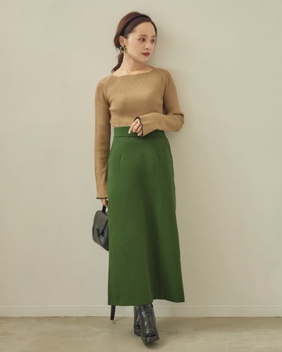 トップスをインしてコーディネートするなら、スカートは引き締まって見えるダークカラーを選ぶのがベストです。
