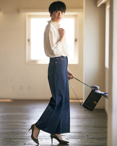 程よい生地感のデニムパンツを合わせれば、ヒップラインを自然に引き締めた大人のカジュアルスタイルに。