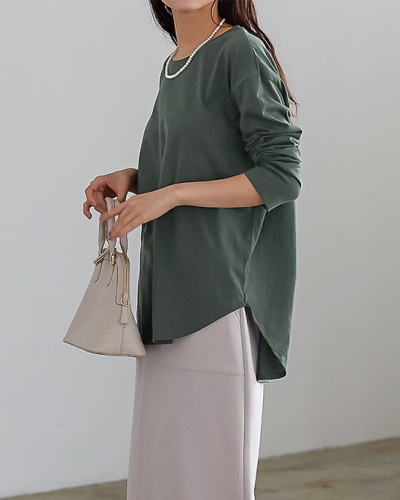 ラウンドヘムとはまた違った印象に仕上がるのが、まっすぐな裾のサイドスリットトップスです。