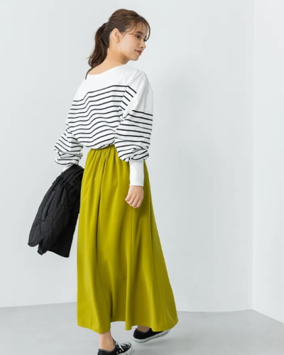 ウエストゴムで軽いギャザーを入れたスカートは、フレアのゆとりでお尻の大きさをカバーすることができます。