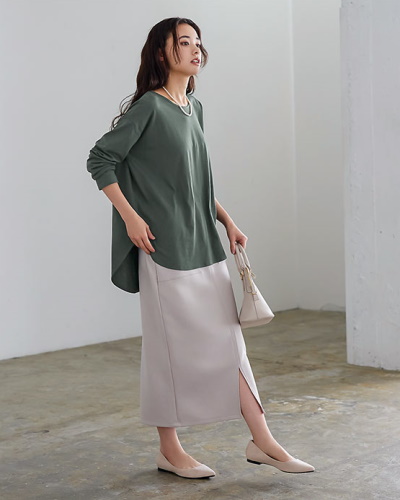 ストンとしたシルエットのIラインスカートを履くと、ウエストから足首までが一直線に繋がり、お尻の大きさが目立ちにくくなります。