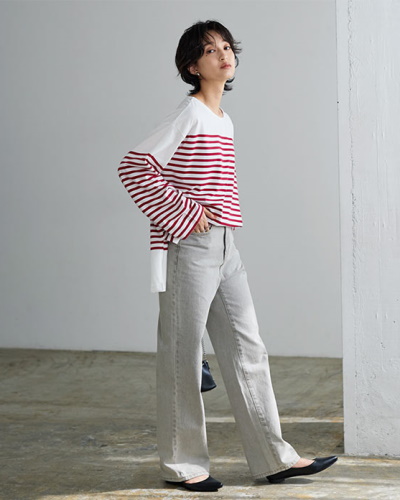 下半身がきれいに仕上がると、トップスインの着こなしもスタイリッシュに決まります。