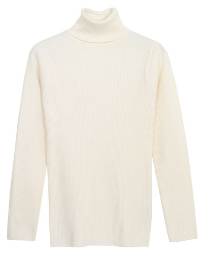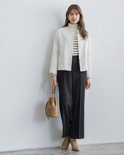 白のタートルネックニットはコーディネート全体を明るく見せる効果も期待できて、春に向けてのおしゃれに大活躍。冷え込みの激しい日は、保温性の高いツイードジャケットやカーディガンを重ね、寒さ対策を万全にして出かけましょう。