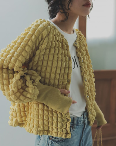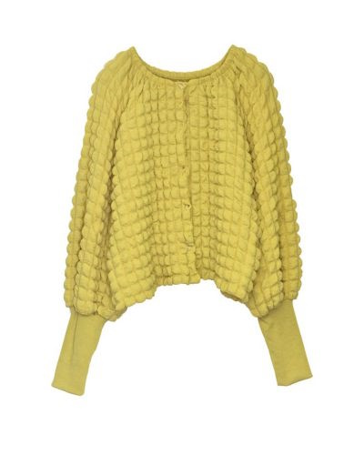 新作アイテムで目を惹くのが、ポコポコとした生地を使ったユニークなカーディガン。