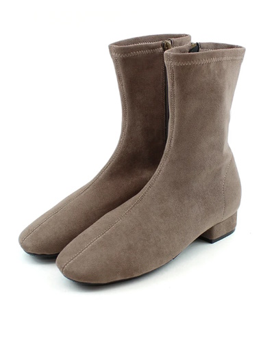スウェード調のストレッチブーツは、スカートやワンピースといったフェミニンなアイテムとも好相性です。