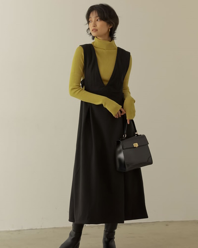 サッと着て決まるのはやっぱりワンピース。上品できちんと感のあるジャンパースカートは大人の女性にぴったりで、明るいカラーのタートルネックニットとレイヤードすれば、春らしさと暖かさの面でも申し分なしです。