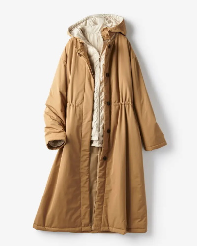 機能性アウターのラインナップには、コートとキルティング素材のフードジャケットがセットになったタイプも登場しています。