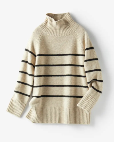 タートルネックニットとの組み合わせでは、白いニットで爽やかさいっぱいに、黒いニットとネックレスでリッチな雰囲気になど、同じストライプでも違う雰囲気にスタイリングが可能です。