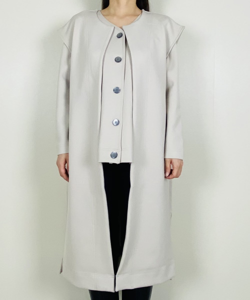 フレンチスリーブのジレと厚みのあるカーディガンのセットで、コート感覚で使用できます。