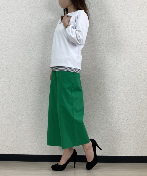 グリーンのひときわ目立つワイドパンツでシンプルにコーディネート。ウエスト回りからヒップ、太ももまでしっかりカバーしつつ、すっきり見えるようなシルエットになります。シャツ合わせでシンプルに。