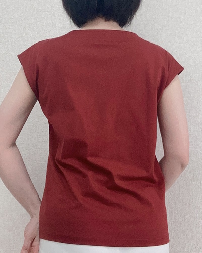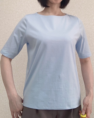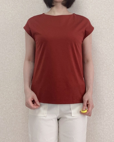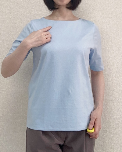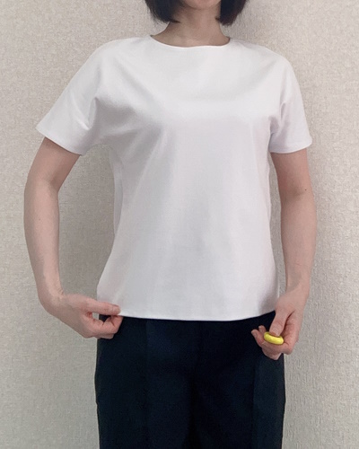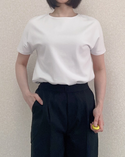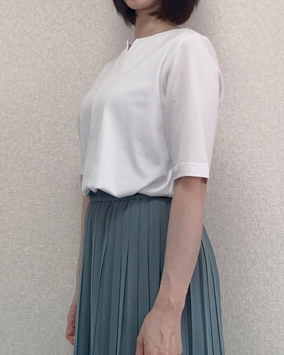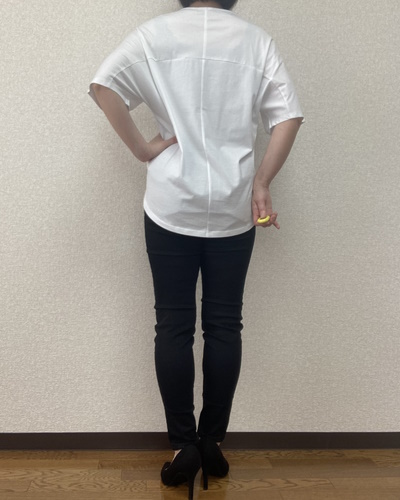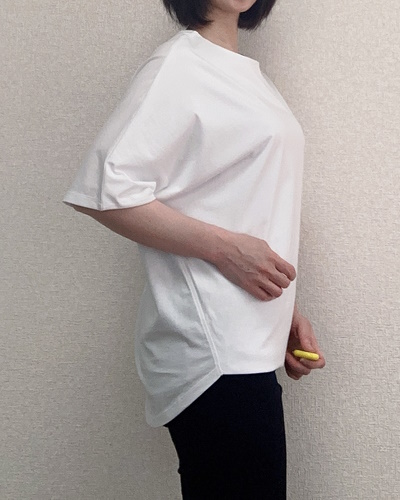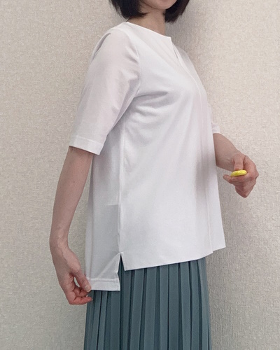 身につけると生地の上質さが際立ち、Tシャツというよりブラウスに近い見た目です。
