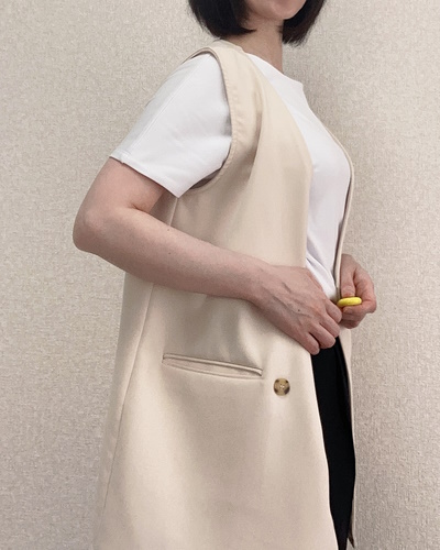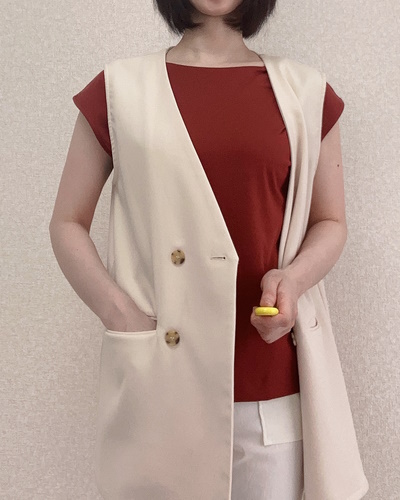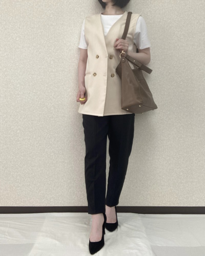 打ち合わせで外出する日は、ドゥクラッセTシャツにジレを重ねて、知的で今季らしいトラッドスタイルに。