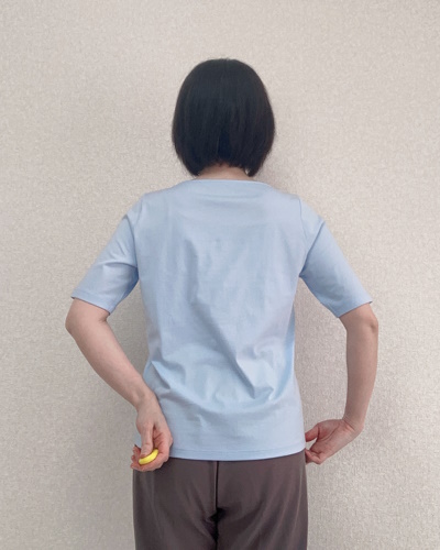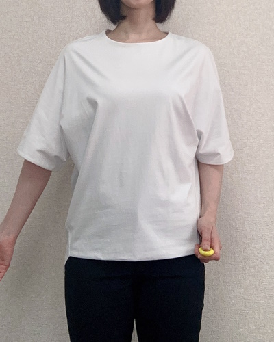 こちらのTシャツは「立体フォルムシリーズ」の1枚。肩で切り替えないドルマン袖にすることで、体型を問わずきれいにフィットし、肩から腕にかけてキレイに見せてくれますよ。