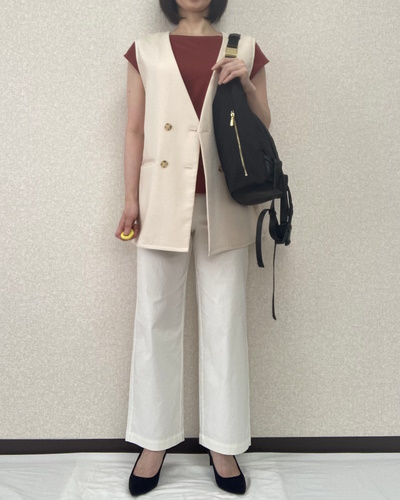 - 7 水曜日「レッドTシャツを効かせた大人のジレコーデ」