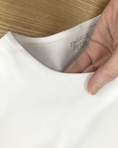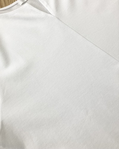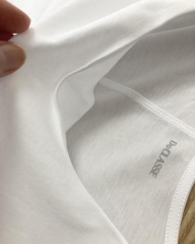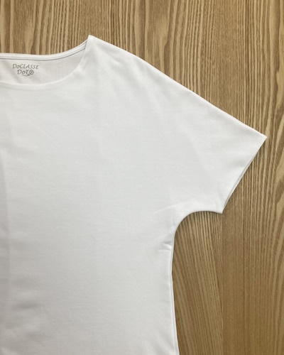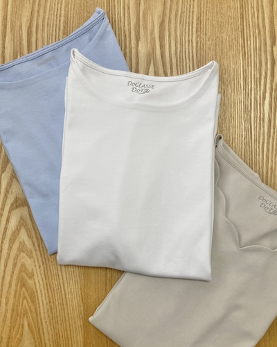 ドゥクラッセTシャツでは、ダブルフロントという前身頃を二重にする仕立て方により、インナーの色が透けず、体のラインも拾いにくくなっています。